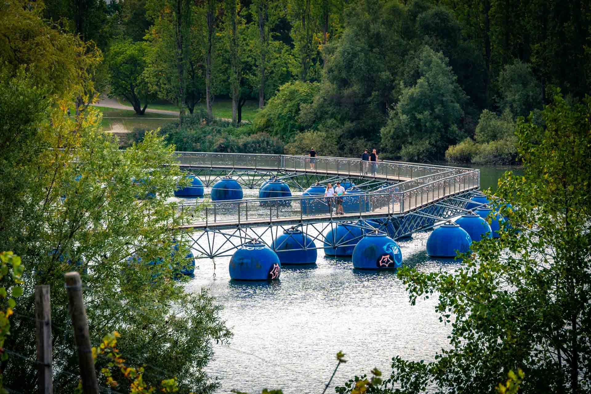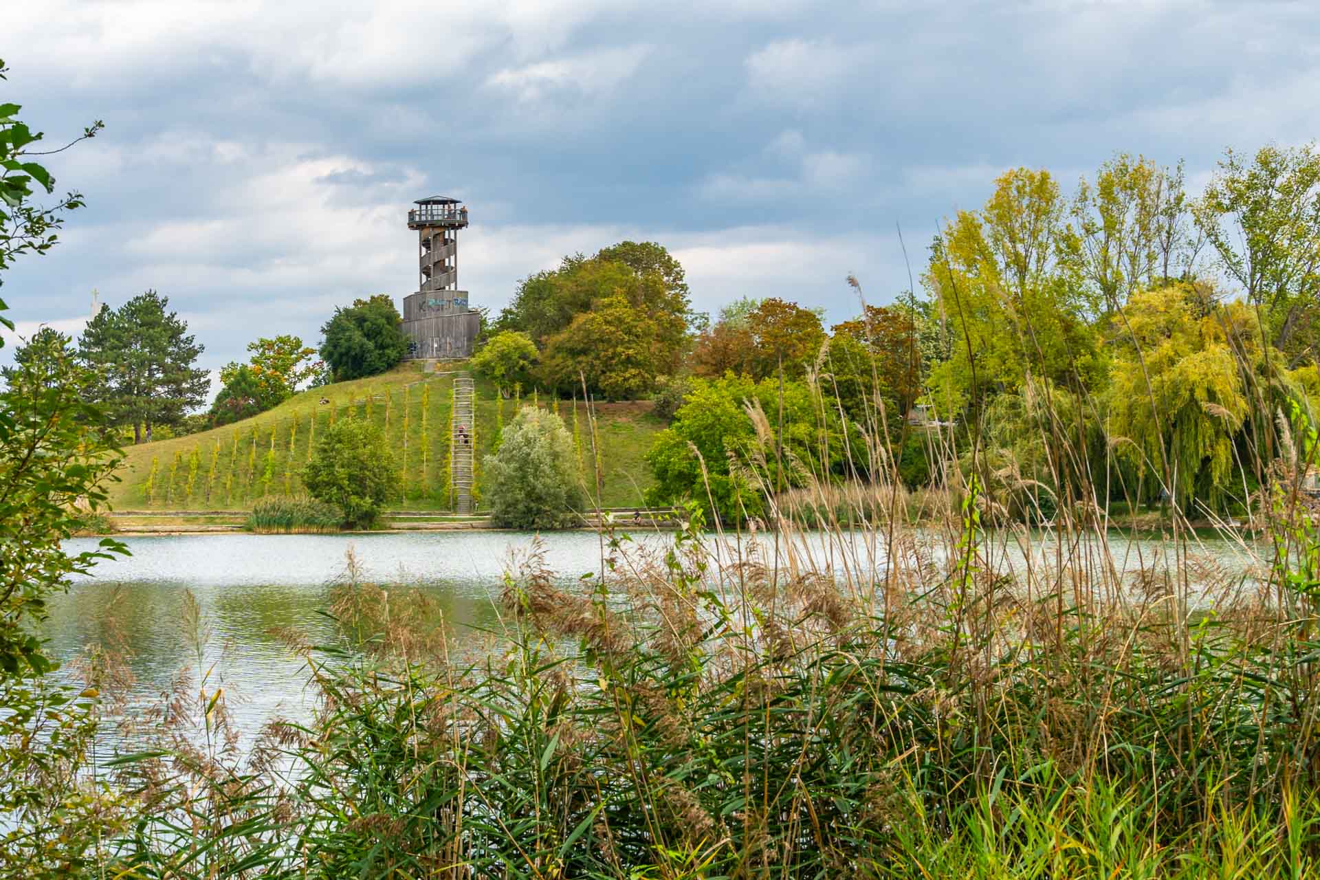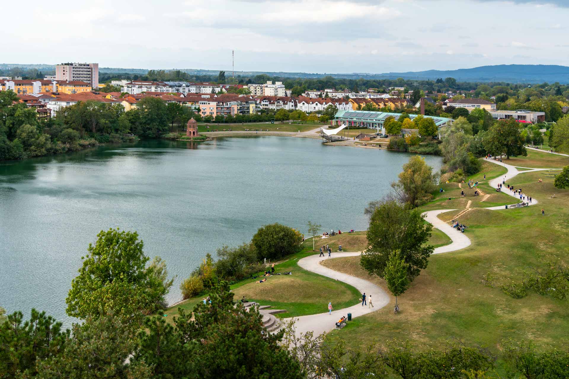 Das Wasser des Sees bietet im Sommer Erfrischung für Badelustige, während andere sich auf den weitläufigen Grünflächen entspannen oder grillen. Ein Highlight ist die kleine Insel, die über eine Brücke erreichbar ist und einen wunderbaren Blick über den See bietet. Für Kinder gibt es zudem Spielplätze, und Wassersportler können Tretboote ausleihen oder auf dem See paddeln.