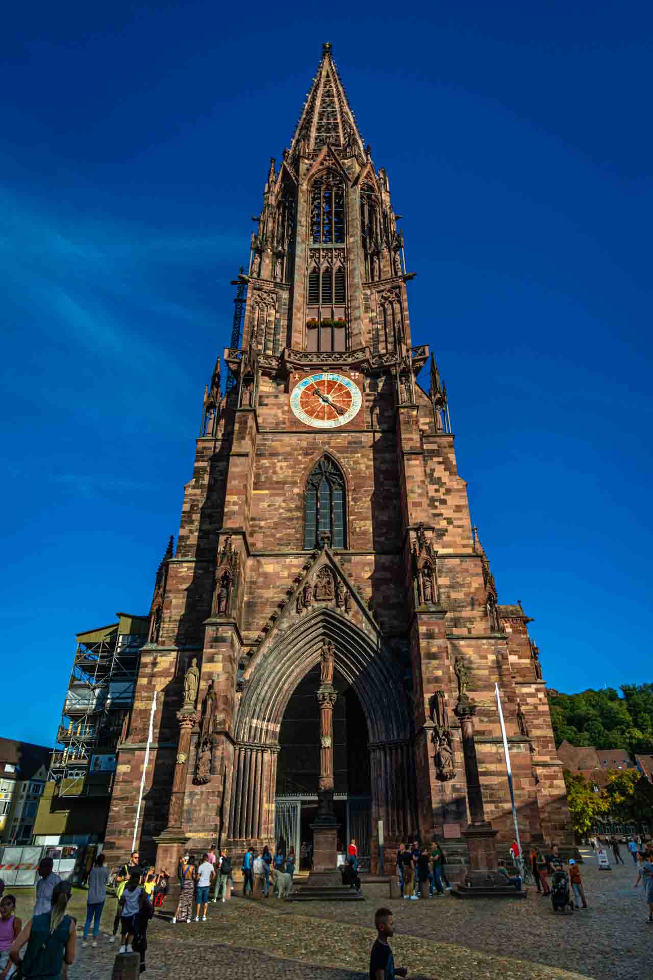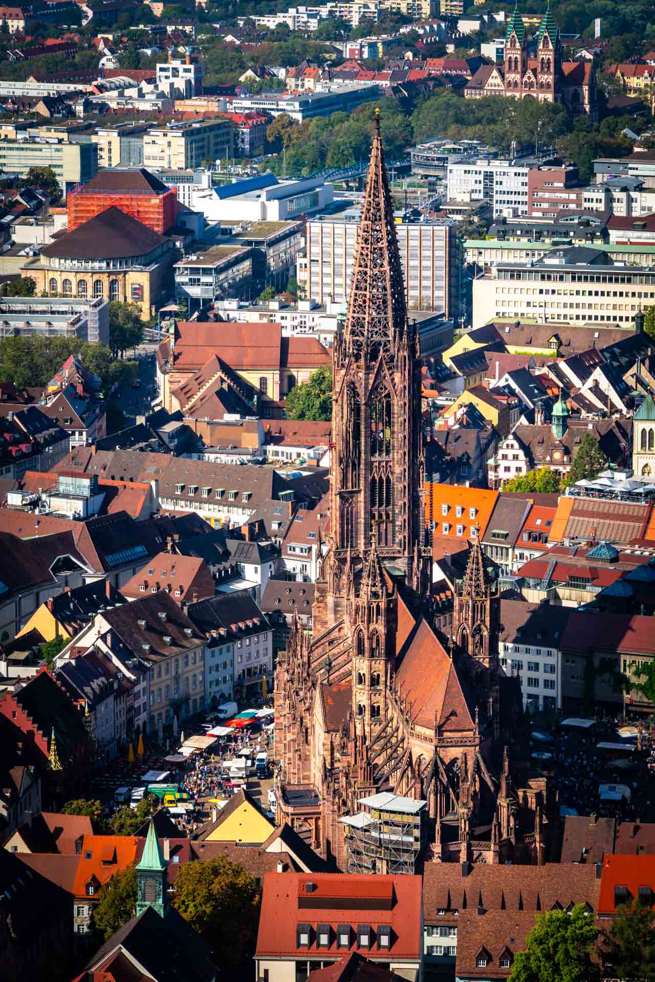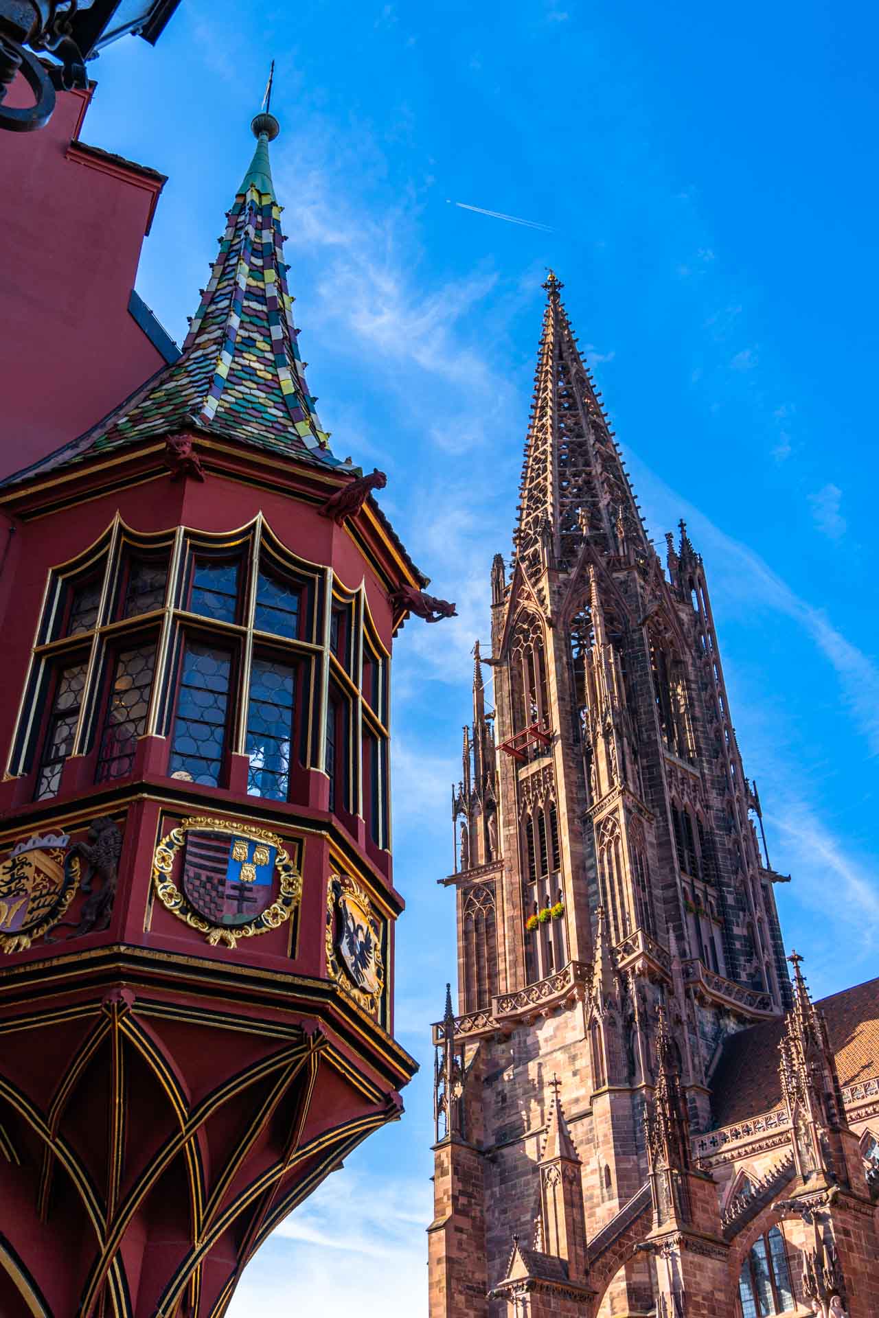 Das Freiburger Münster steht auf dem Münsterplatz, dem größten und zentralsten Platz der Altstadt. Rund um das Münster reihen sich prächtige Bürgerhäuser, historische Gebäude und gemütliche Cafés. Besonders lebendig wird der Platz, wenn der Wochenmarkt stattfindet.
