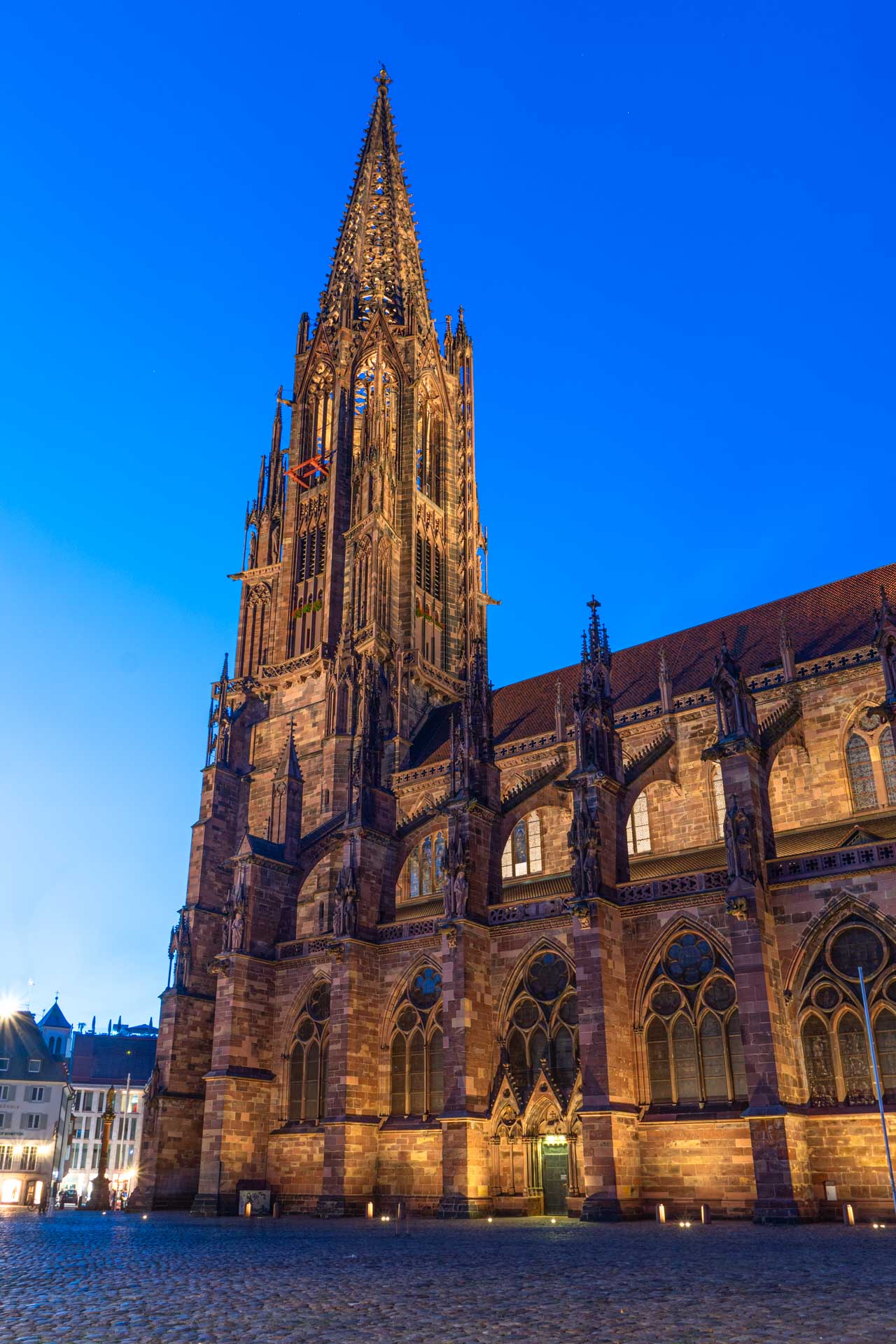 Das markanteste Merkmal des Freiburger Münsters ist der filigrane, durchbrochene Turm, der weit über die Stadt hinaus sichtbar ist. Der Turm, der aus rotem Sandstein besteht, wirkt trotz seiner massiven Größe erstaunlich leicht und luftig. Seine einzigartige durchbrochene Struktur verleiht ihm eine geradezu himmlische Leichtigkeit, die besonders bei Sonnenschein zur Geltung kommt.