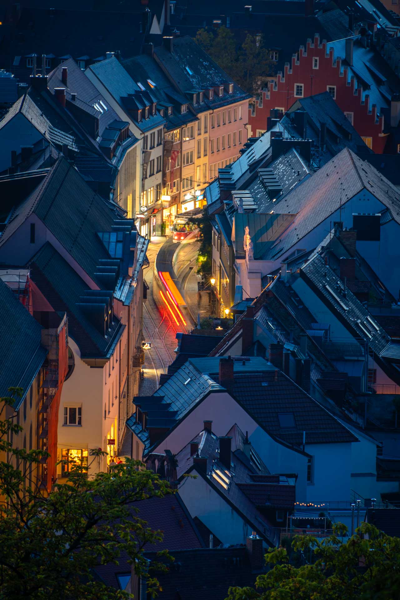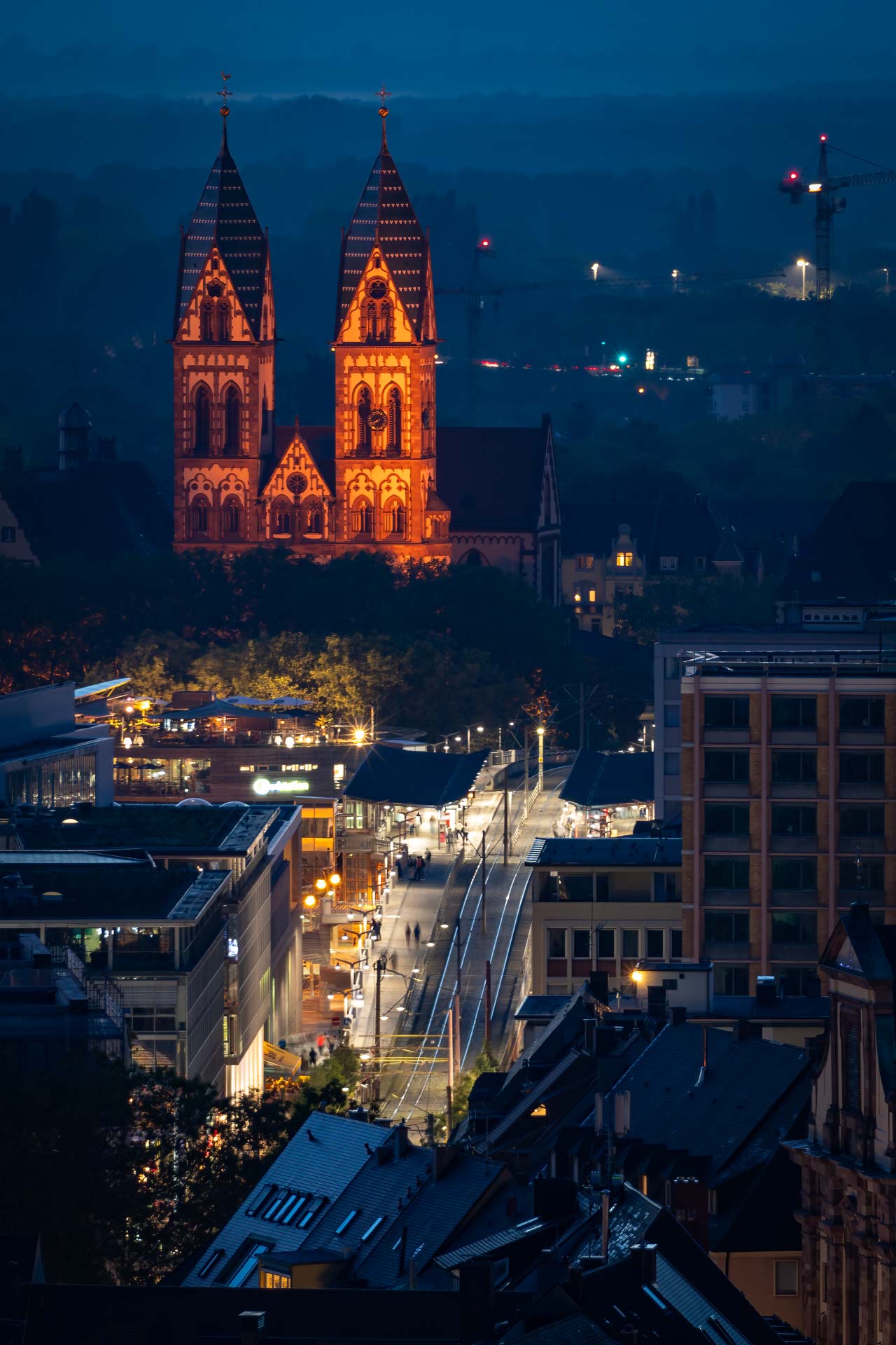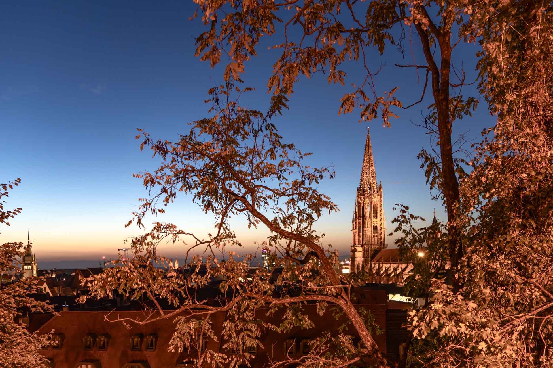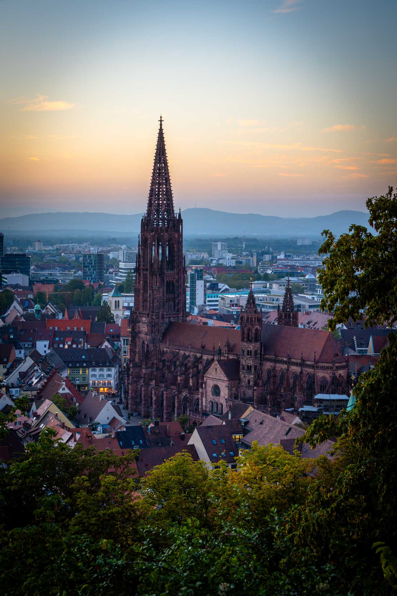 Vom Kanonenplatz aus hat man einen perfekten Panoramablick auf Freiburg. Besonders die Altstadt wirkt in diesem Moment fast märchenhaft: Die roten Dächer und der filigrane Turm des Münsters leuchten in den letzten Sonnenstrahlen, während sich die Schatten der schmalen Gassen langsam verlängern. Der Himmel wechselt seine Farben von einem satten Orange zu Rosa- und Violetttönen, bis die Dunkelheit schließlich über die Stadt fällt.